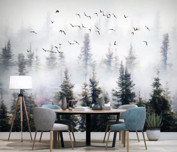 35.08 zł21.05 złFototapeta Ptaki latające nad zamglonym lasem