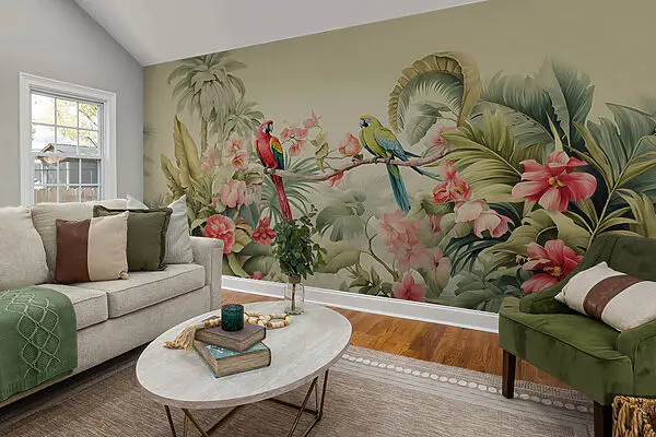 35.08 zł21.05 złFototapeta Para papug na gałęzi z kwiatami
