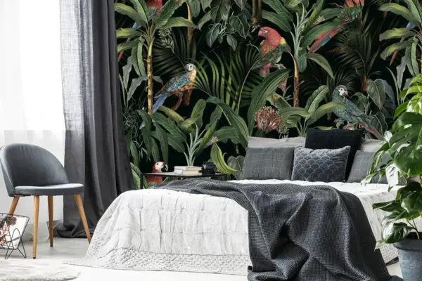 Fototapeta Fototapeta Tapeta z tropikalnymi roślinami i ptakami (SKU: u95371)