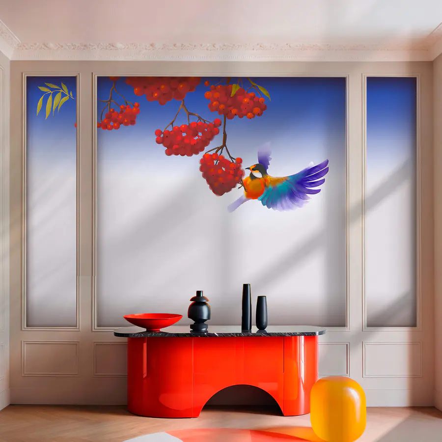 Fototapeta Ptak jedzący kiść czerwonych jagód