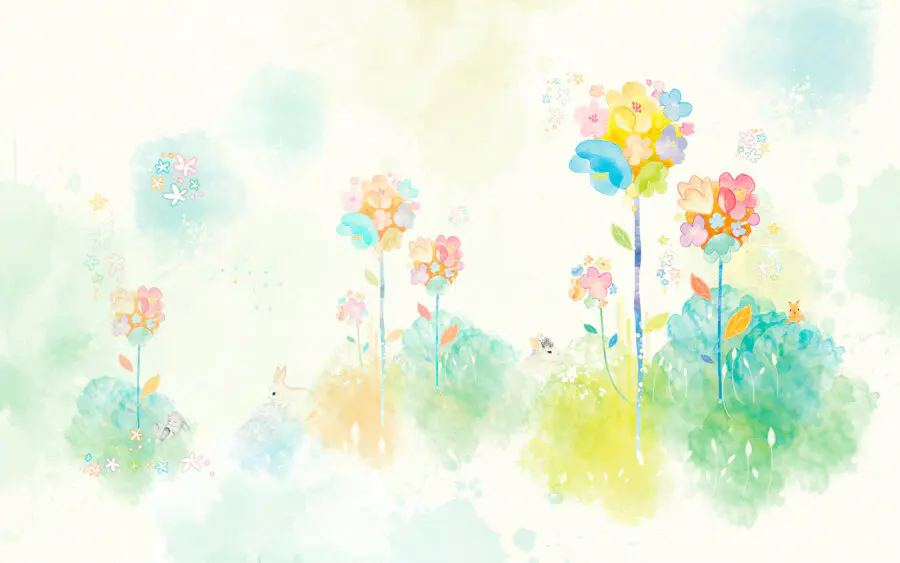 Fototapeta Akwarela przedstawiająca kwiaty i króliki