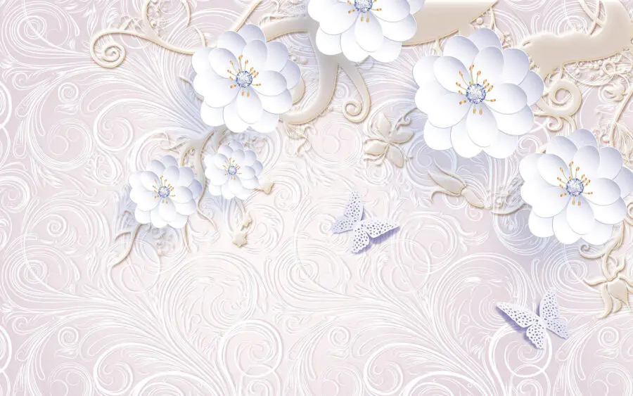 Fototapeta Tapeta z białymi kwiatami i motylami