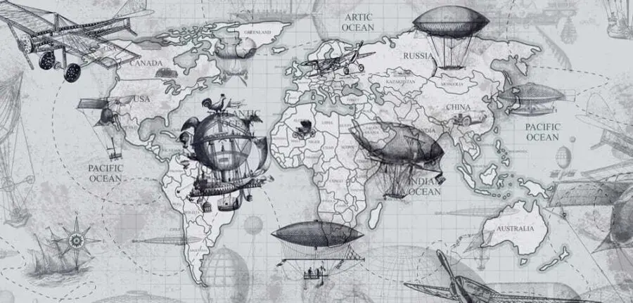 33.33 zł20.00 złFototapeta Mapa świata z samolotami i balonami na ogrzane powietrze