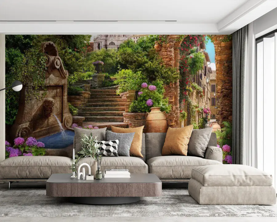Fototapeta Kamienna ścieżka z fontanną, schodami i kwiatami