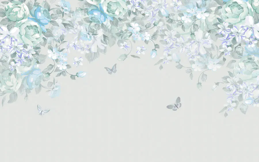 Fototapeta Biało-niebieskie kwiaty i motyle