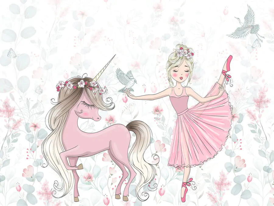 Wyobraź sobie, że wchodzisz do pokoju z tą marzycielską fototapetą - to jak wejście prosto do bajki! Ta fototapeta ścienna "Jednorożec i dziewczynka" to idealne połączenie kaprysu i cudowności, dzięki czemu będzie hitem w każdym dziewczęcym pokoju. Delikatne pastelowe kolory są super kojące, a magiczny jednorożec z kwiatową koroną w połączeniu z wdzięczną baletnicą po prostu oczarowuje. Idealna do pobudzania niekończącej się wyobraźni, fototapeta przekształca każdą przestrzeń w kapryśny świat. Wyobraź sobie bajki na dobranoc przy delikatnym blasku lampki nocnej, gdzie jednorożce tańczą, a sny ożywają. To nie tylko fototapeta; to płótno dla marzeń i kreatywności.