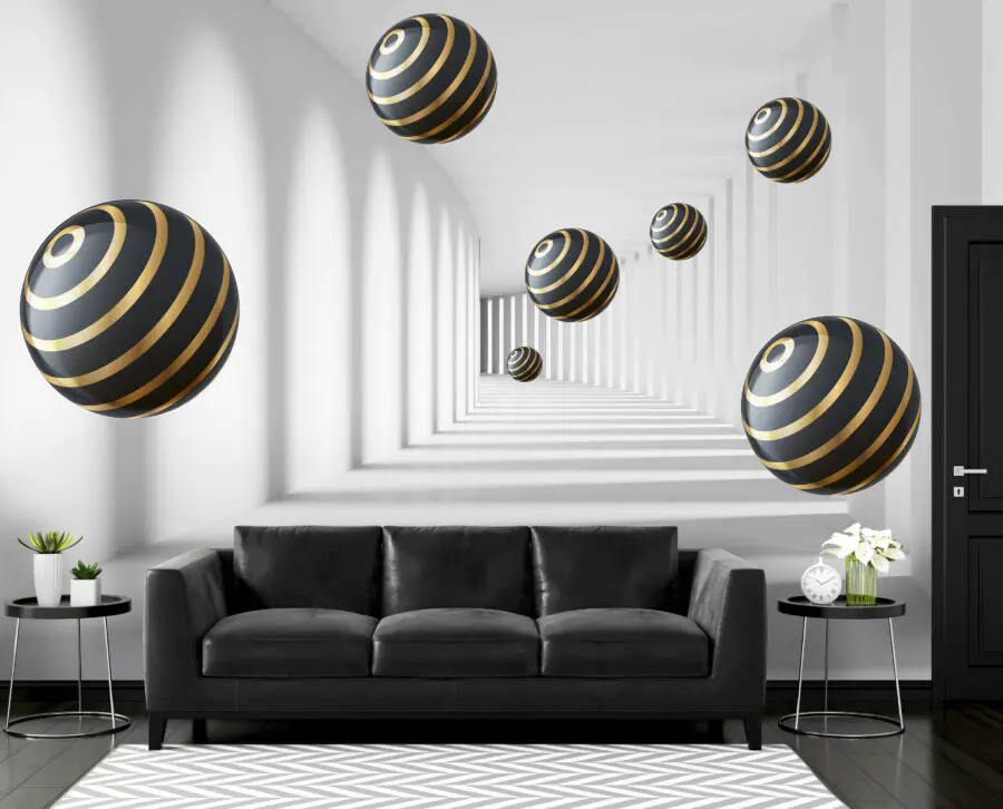 Fototapeta Kule w paski unoszą się w białym korytarzu