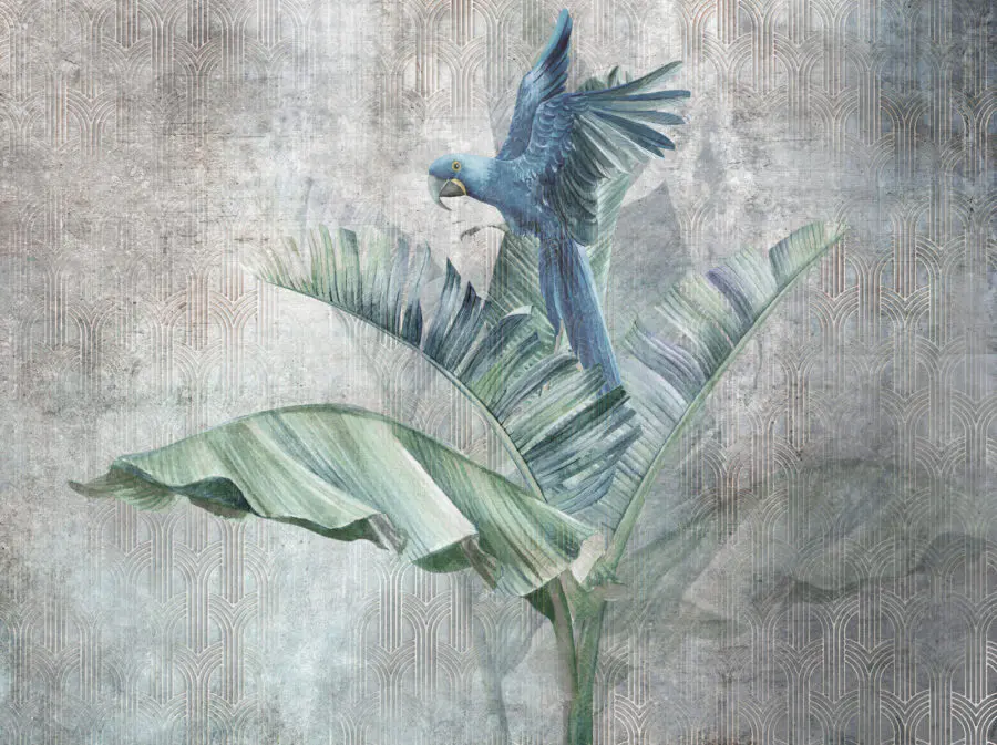 Fototapeta Niebieska papuga na liściu bananowca
