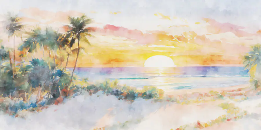 33.33 zł20.00 złFototapeta Akwarela przedstawiająca plażę z zachodem słońca