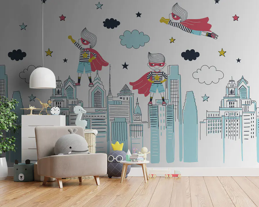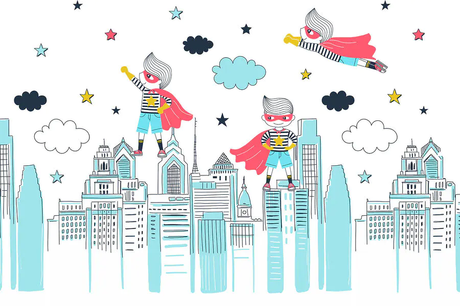 Fototapeta Kreskówka przedstawiająca superbohatera na tle miasta