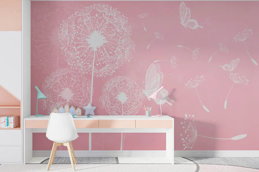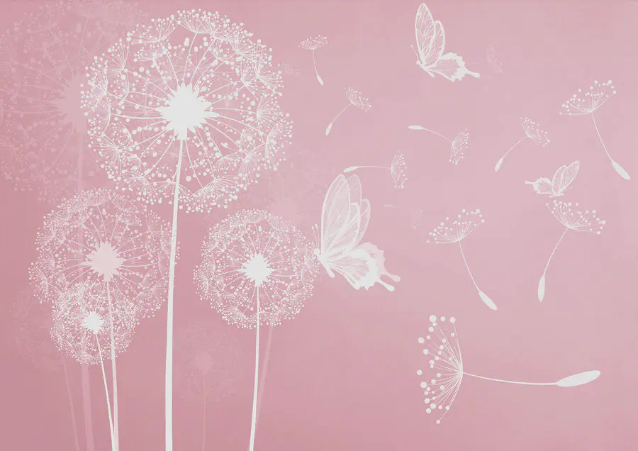 Fototapeta Różowe tło z białymi mleczami i motylami
