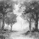 Fototapeta Mglisty las z drzewami i krzewami