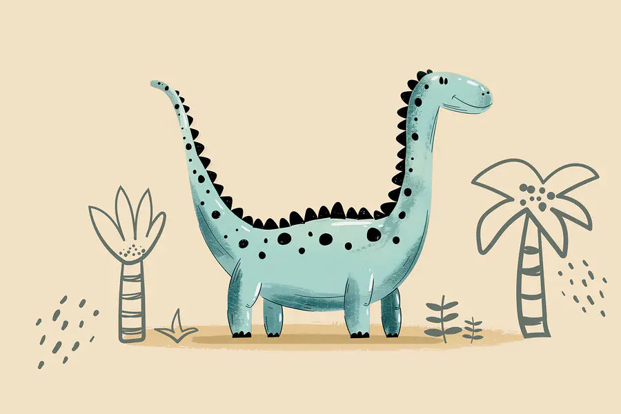 Fototapeta Kreskówkowy dinozaur z roślinami i liśćmi