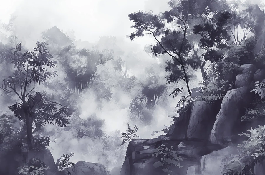 Fototapeta Mglisty las z drzewami i skałami