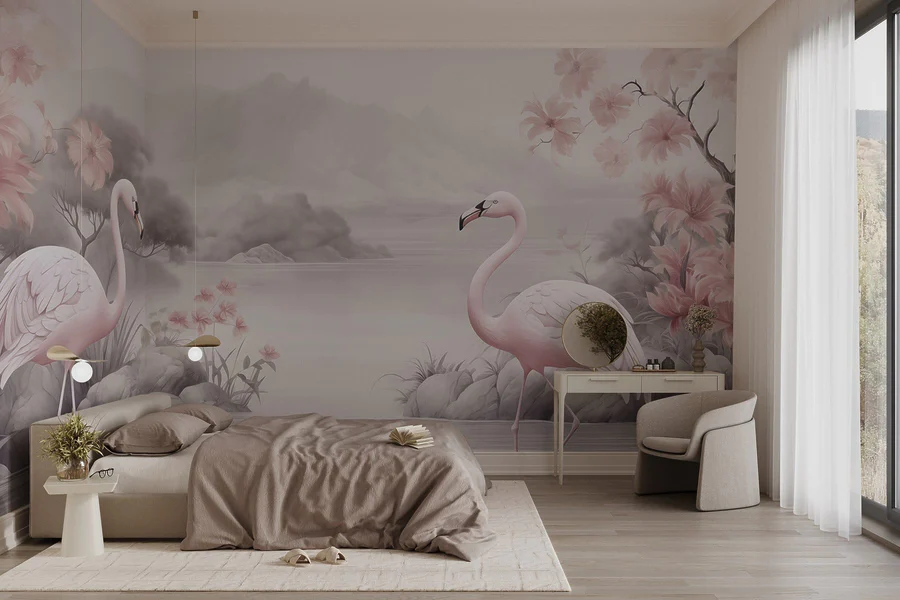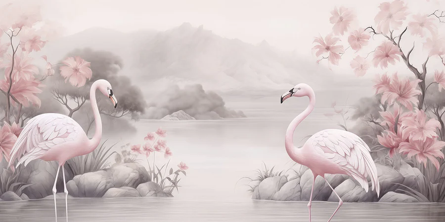 Przekształć dowolną ścianę w spokojną ucieczkę dzięki fototapecie "Flamingi w jeziorze". Wyobraź sobie dwa eleganckie flamingi brodzące w łagodnym jeziorze, otoczone miękkimi, marzycielskimi odcieniami i delikatnymi kwiatami - to jak wejście do spokojnego japońskiego ogrodu bez uciążliwych komarów. Wyobraź sobie, że popijasz herbatę, czujesz powiew wiatru, a może nawet udajesz, że sam jesteś flamingiem - z jedną nogą w górze. Ta fototapeta nie tylko zdobi; ona opowiada historię. Historię, która mówi: "Tak, mógłbyś tu mieszkać". Jest idealna do stworzenia spokojnej oazy w sypialni lub eleganckiego punktu centralnego w salonie. Więc śmiało, zanurz się w tej spokojnej przystani. Twoje ściany będą Ci wdzięczne!