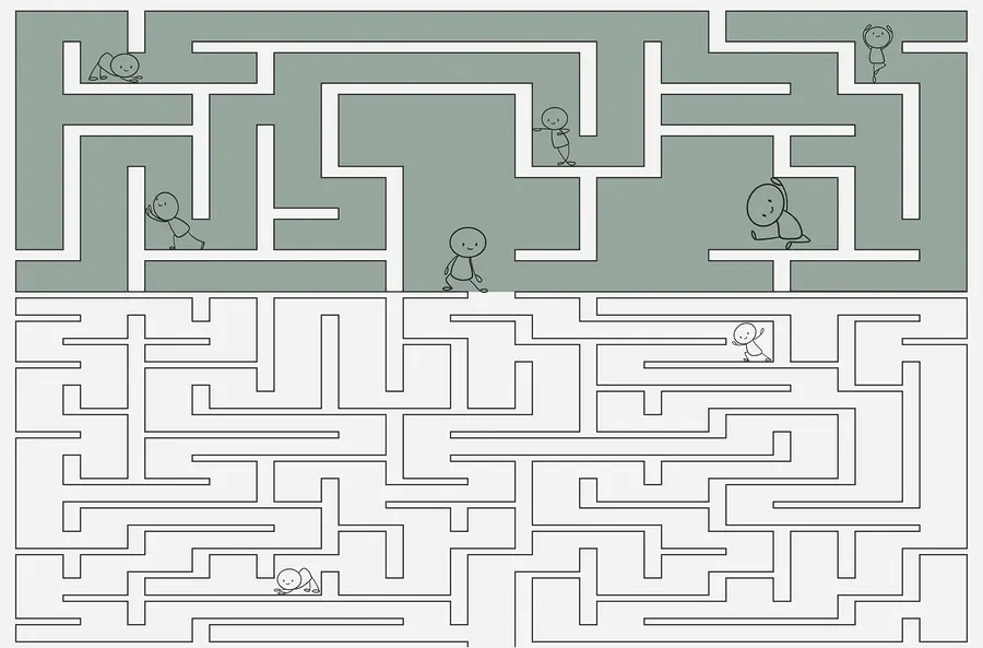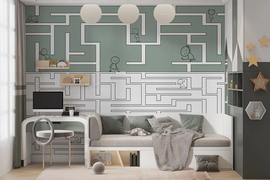 Fototapeta Gra z labiryntem z postaciami z kreskówek przechodzącymi przez labirynt