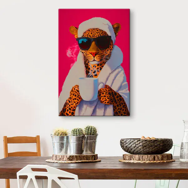 98.34 zł59.00 złObraz Obraz lamparta w szacie i okularach przeciwsłonecznych trzymającego kubek