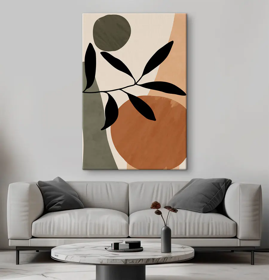 Obraz Czarny liść na gałęzi z kółkami i okręgami