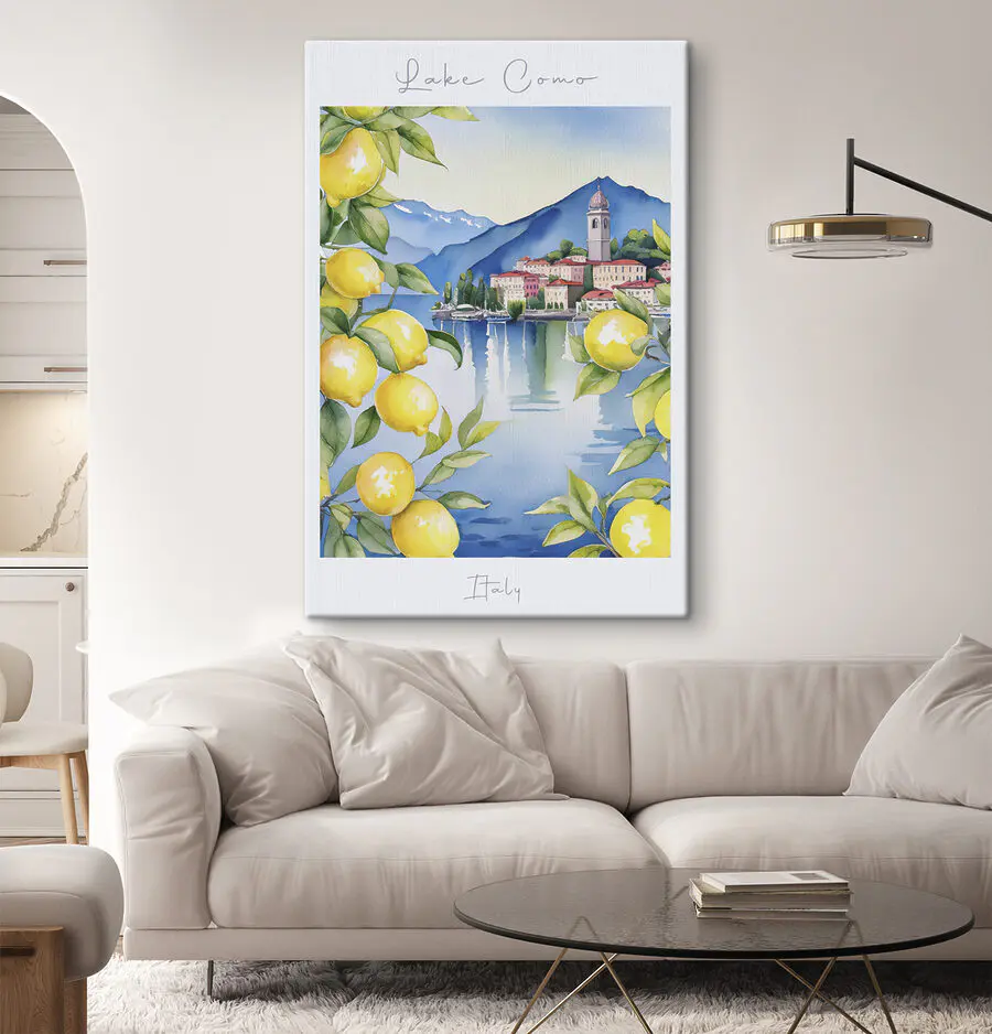 Obraz Akwarela przedstawiająca miasto i góry z żółtymi cytrynami