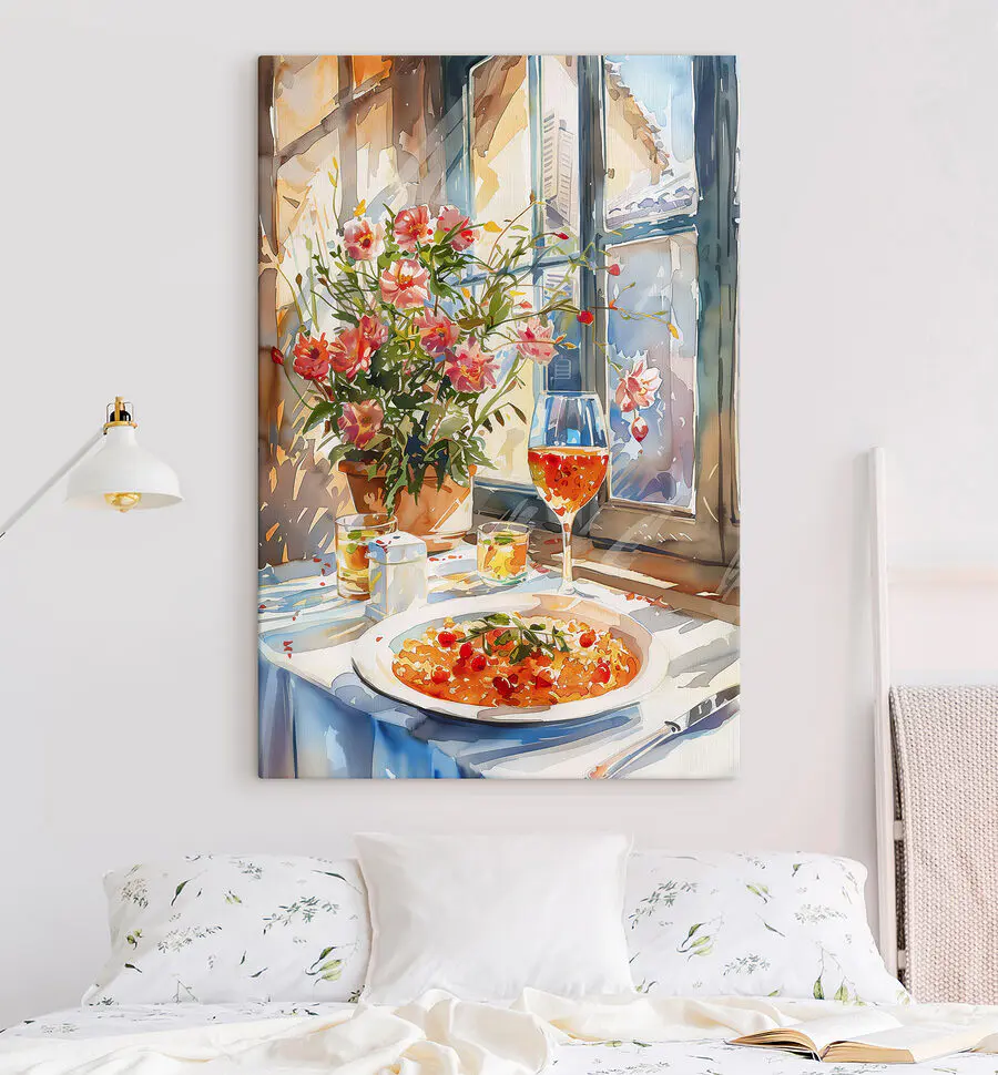 Obraz Akwarela przedstawiająca stół z jedzeniem i kwiatami
