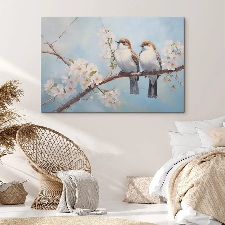 Obraz Dwa ptaki na gałęzi z białymi kwiatami