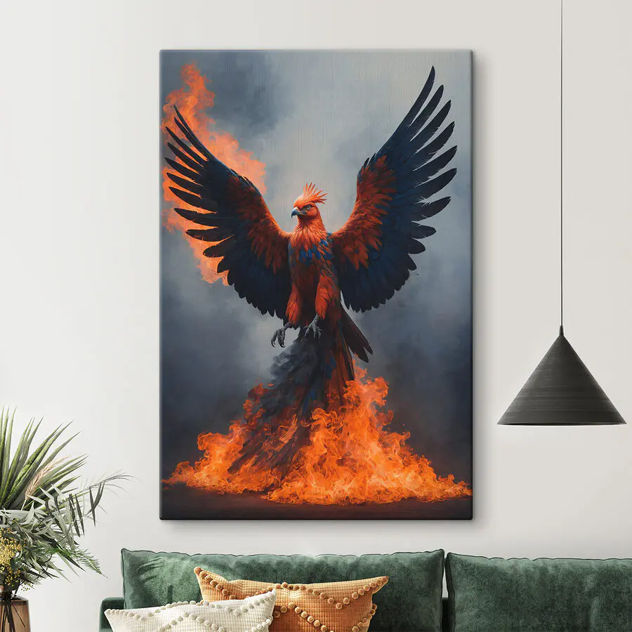 Here’s a piece that’s sure to steal the spotlight—imagine a bird with wings spread in fiery glory! This canvas print is like a burst of life for your wall. It’s got that “I’m here!” vibe. Perfect for anyone who wants to add a splash of drama and color to their space. Place it in a living room, and friends might just stop mid-coffee sip to admire it. The detail in those feathers is mesmerizing—kinda feels like the bird might just take flight. A bold statement and a touch of art all rolled into one.