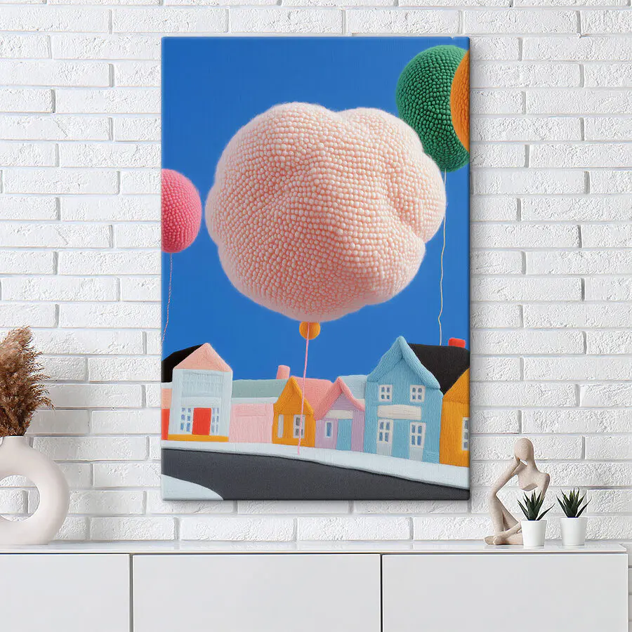 Wyobraź sobie magiczną małą wioskę, w której niebo usiane jest puszystymi balonami - każdy gotowy do uniesienia się na wietrzną przygodę. Ten druk na płótnie jest jak kapryśny sen uchwycony w powietrzu. Idealny, aby sprawić, że każdy pokój poczuje się jak zabawna ucieczka, może po prostu przekonać Cię, że chmury są zrobione z waty cukrowej! Idealny dla dzieci i dorosłych, którzy nigdy nie przestali marzyć. Zestawienie tętniących życiem domów i jasnego, błękitnego nieba może podnieść na duchu niczym hel!