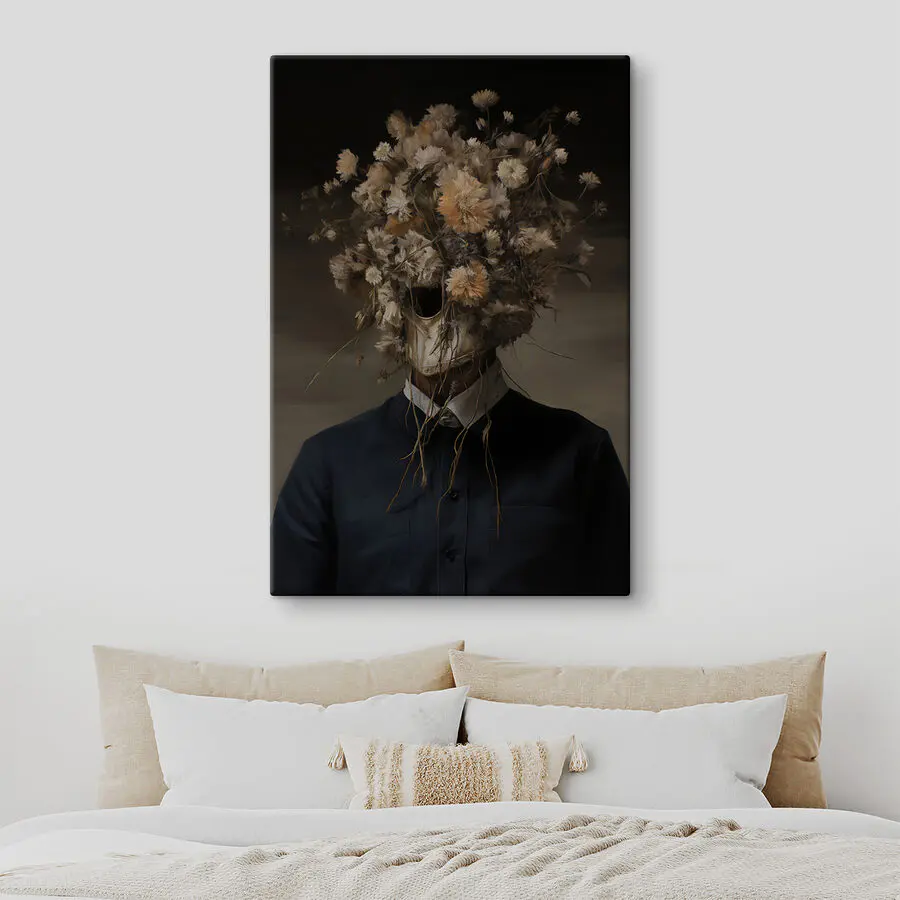 Wkrocz do świata, w którym kwiaty zajmują centralne miejsce, dosłownie! Ten uderzający wydruk na płótnie przedstawia postać ozdobioną imponującą koroną kwiatów, zachęcającą do wszelkiego rodzaju myśli i uczuć. Wyobraź sobie, że wisi w korytarzu lub przytulnym kąciku, w którym płynie kreatywność. Wyobraź sobie, że przyjaciele zatrzymują się, otwierają oczy i zastanawiają się: "O co tu chodzi?". To sztuka, która pobudza do rozmowy - co to znaczy lub dlaczego ten elegancki strój z tak dzikim kwiatowym akcentem? Dzięki ciepłym i ziemistym odcieniom jest to idealne połączenie uroku natury i odrobiny nieoczekiwanego. Rozjaśnij przestrzenie, które potrzebują odrobiny dziwactwa; ten element z pewnością wywoła uśmiech!