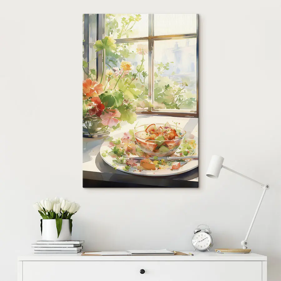 Obraz Akwarela przedstawiająca miskę z jedzeniem i kwiatami przed oknem