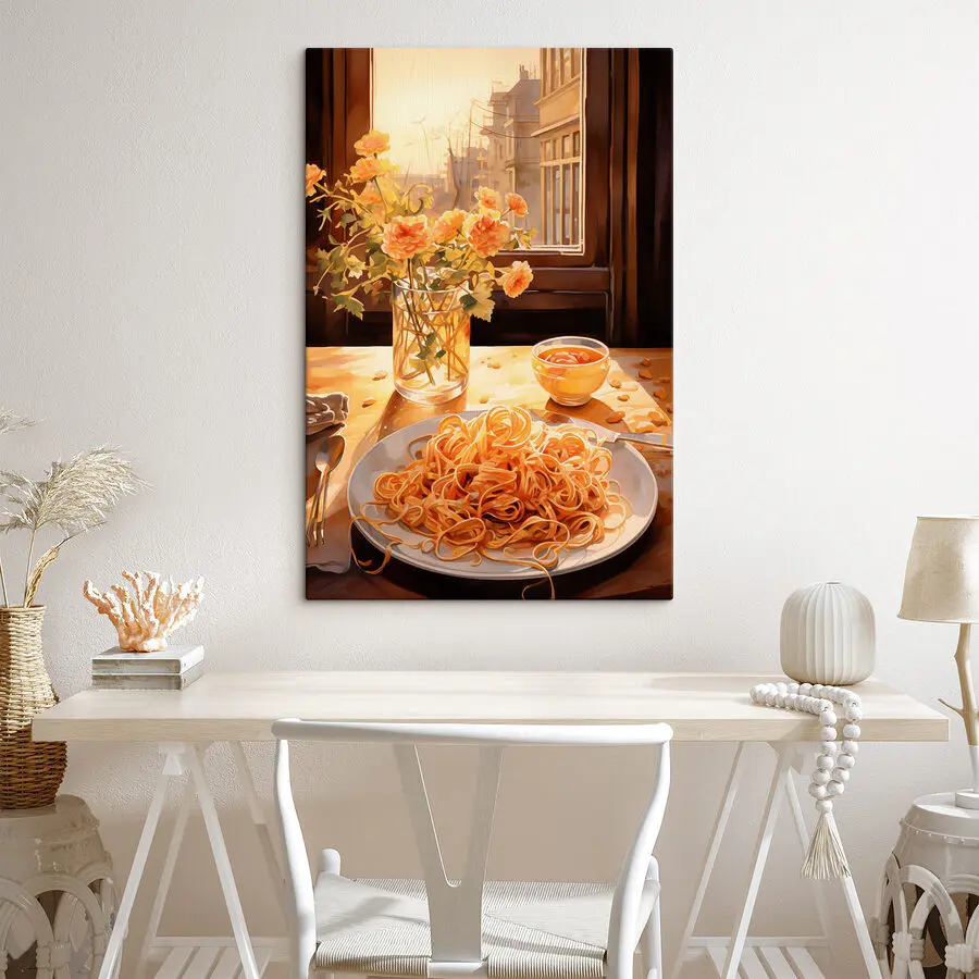 Wyobraź sobie stół zastawiony makaronem i kwiatami, bez gotowania i prac ogrodowych. Ten wydruk na płótnie przenosi ten przytulny, słoneczny urok prosto na ścianę. To jak romantyczna kolacja we włoskim bistro, bez konieczności kupowania biletu lotniczego! Idealny dla smakoszy i miłośników kwiatów, dodaje odrobinę elegancji i kaprysu do każdego pomieszczenia. Przyjaciele mogą wpaść i nagle zapragnąć spaghetti - nie mów, że nie zostałeś ostrzeżony! Idealny do wywoływania radości lub spontanicznych przyjęć. Buon appetito, miłośnicy sztuki!