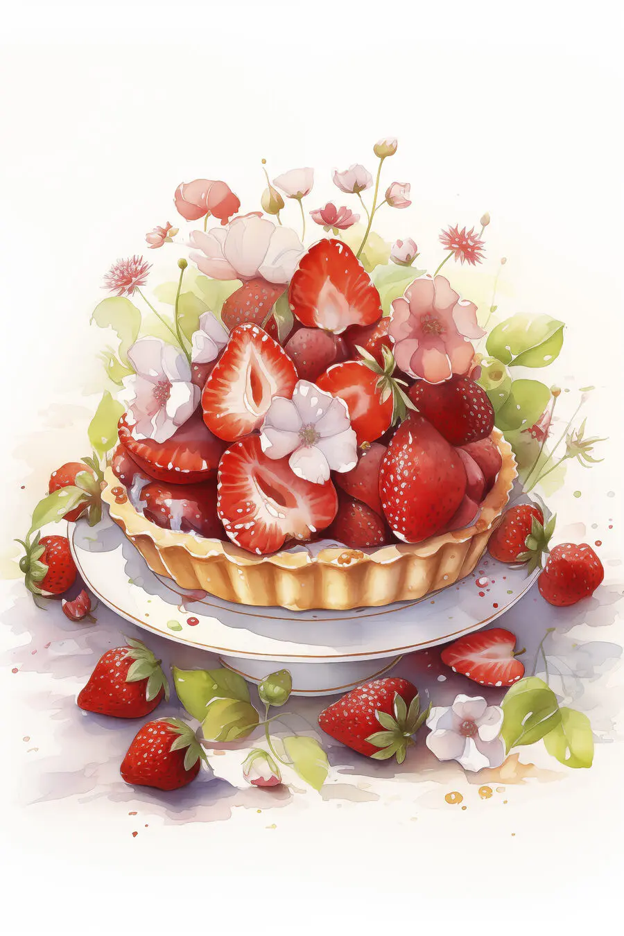 Obraz Akwarela przedstawiająca ciasto z truskawkami i kwiatami