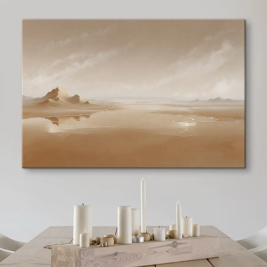 Odmień swoją przestrzeń dzięki temu wspaniałemu drukowi na płótnie przedstawiającemu piaszczystą pustynię, na której góry delikatnie tańczą w oddali. Wyobraź sobie, że siedzisz w oświetlonym słońcem pokoju, popijając ulubiony napój i rozkoszując się ogromem tej spokojnej sceny. To jak przeniesienie się do spokojnej oazy, idealnej do marzeń lub znalezienia chwili spokoju. Ciepłe odcienie mogą uprzyjemnić każdy kąt, czyniąc go fantastycznym początkiem rozmowy lub po prostu pięknym tłem dla spokojnego popołudnia. Kto by pomyślał, że pustynia może być tak zachęcająca?
