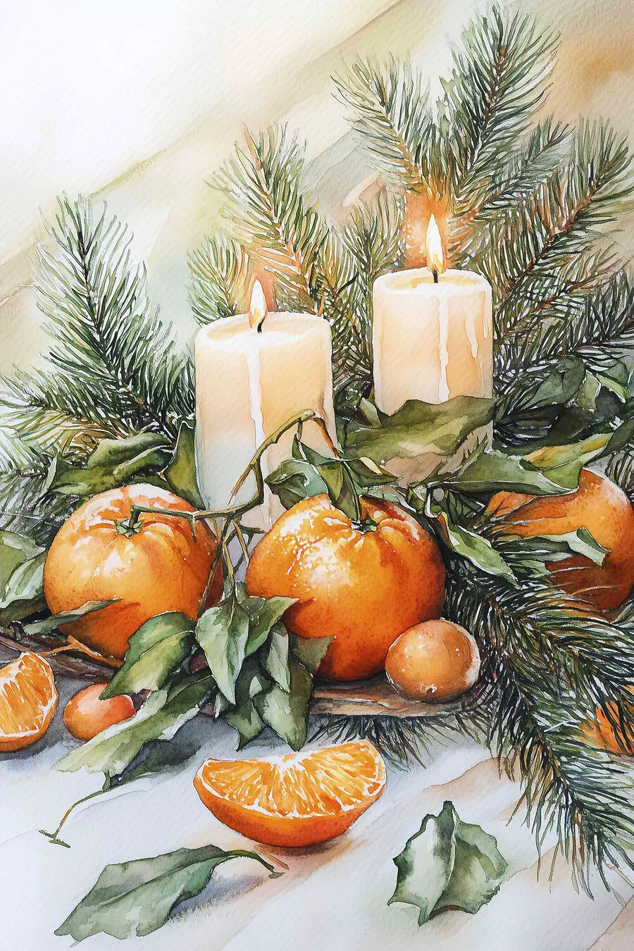 Obraz Akwarela przedstawiająca pomarańcze i świece na stole