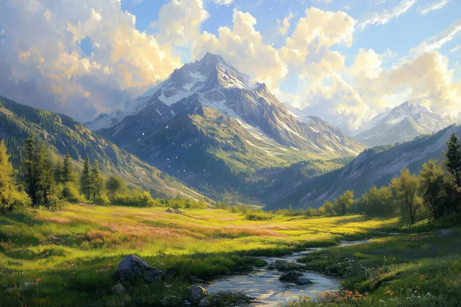 Wyobraź sobie, że relaksujesz się w przytulnym kąciku, delikatna bryza tańczy przez okno, a twoje oczy lądują na tym oszałamiającym płótnie. Rzeka wije się przez bujną dolinę, podczas gdy majestatyczne góry stoją na straży w tle. To jak mini-wakacje bezpośrednio na ścianie. Żywe zielenie i błękity zachęcają do marzeń o popołudniowych wędrówkach i piknikach w słońcu, podczas gdy chmury szepczą historie o odległych krainach. Idealny dla tych, którzy kochają urok natury lub potrzebują odrobiny spokoju w ciągu dnia. Niech ten nadruk zamieni każdy pokój w spokojną ucieczkę - buty turystyczne nie są wymagane!