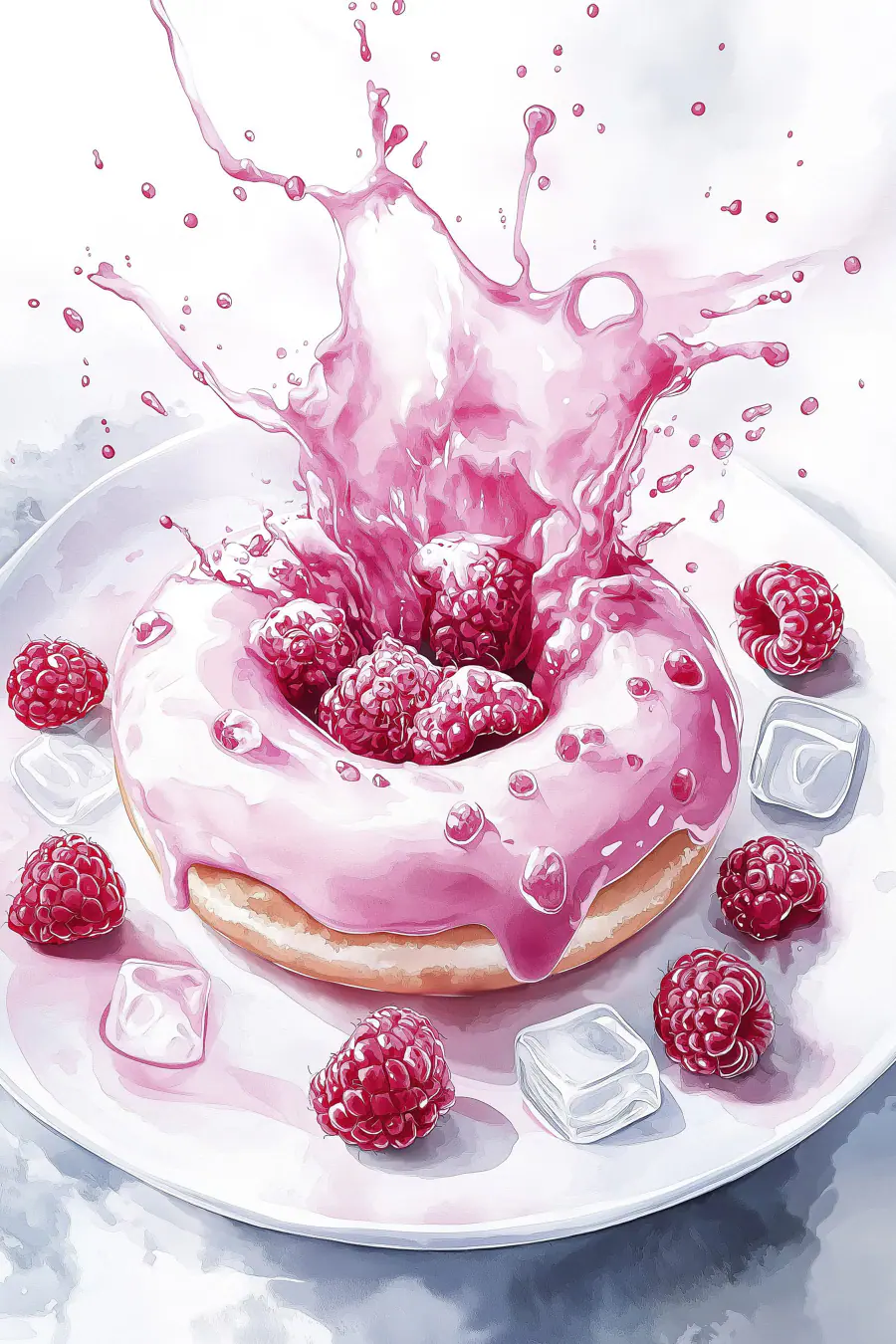 Obraz Pączek z różowym lukrem i malinami rozpryskującymi się na białym talerzu