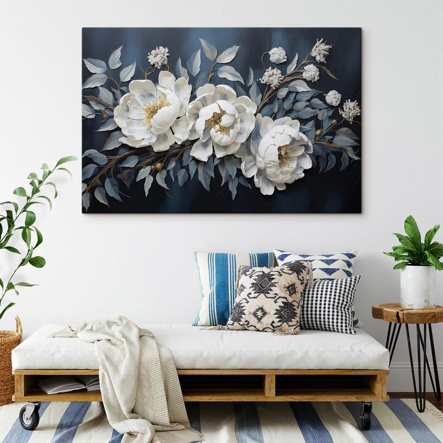 Odmień swoją przestrzeń dzięki temu wspaniałemu drukowi na płótnie z białymi kwiatami i liśćmi na kojącym niebieskim tle. To jak posiadanie świeżego ogrodu w swoim salonie. Wyobraź sobie, że wchodzisz do niego po długim dniu - wszystkie te miękkie płatki i uspokajające kolory natychmiast poprawiają nastrój! Misterne detale doskonale łapią światło, dodając odrobinę elegancji bez zbytniego krzykliwości. Idealny do przytulnego kącika lub jako element dekoracyjny nad sofą. Kto nie uśmiechałby się widząc te kwiaty każdego dnia? To coś więcej niż dekoracja; to jak mały wybuch radości na ścianie!