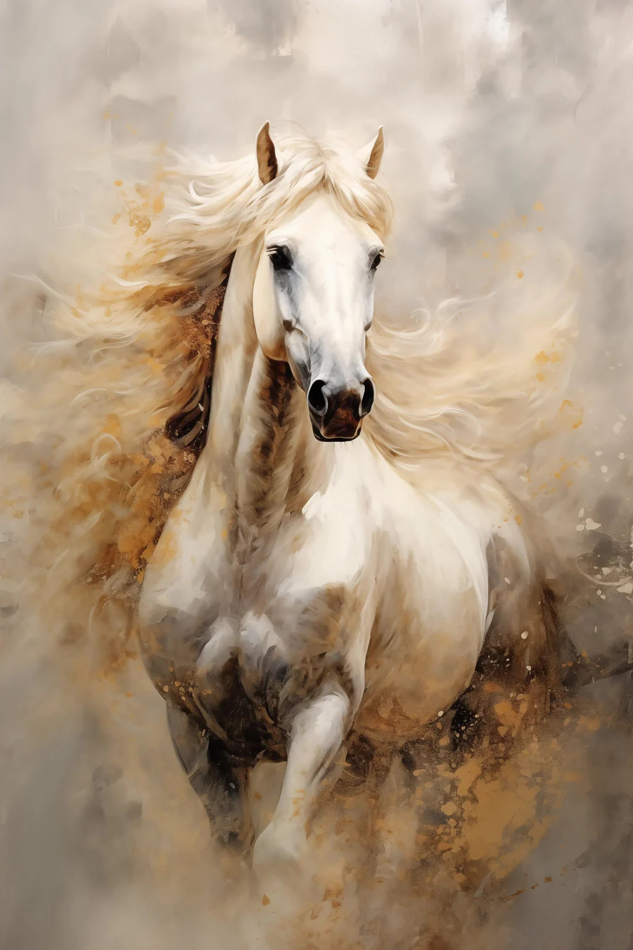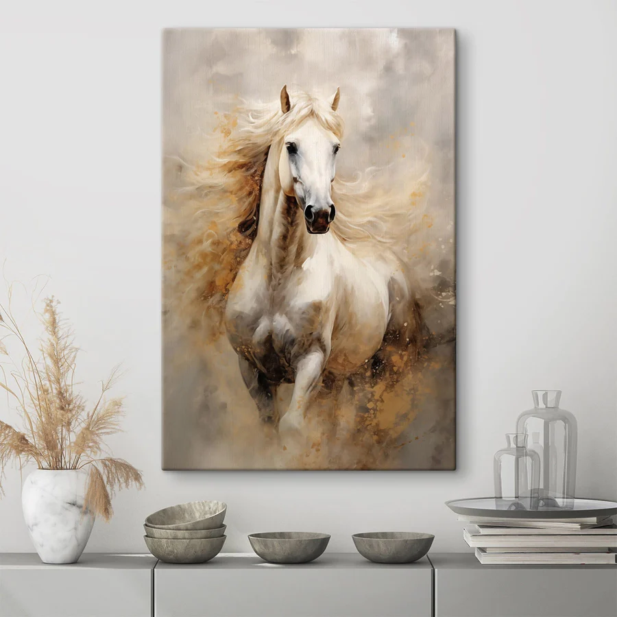 Wkrocz do świata wdzięku i piękna dzięki temu oszałamiającemu obrazowi na płótnie przedstawiającemu białego konia z grzywą spływającą niczym wodospad. To jak ten moment, gdy widzisz majestatyczne stworzenie galopujące przez otwarte pole - prawie słyszysz grzmiące kopyta! Miękkie, ziemiste odcienie doskonale się komponują, tworząc spokojną atmosferę, która może uspokoić każde pomieszczenie. Wyobraź sobie to piękno na ścianie, dodając odrobinę natury i uroku do swojej przestrzeni. To nie tylko dekoracja; to jak posiadanie łagodnego towarzysza, który czuwa nad tobą. Trochę dzikie, trochę spokojne - po prostu idealne!