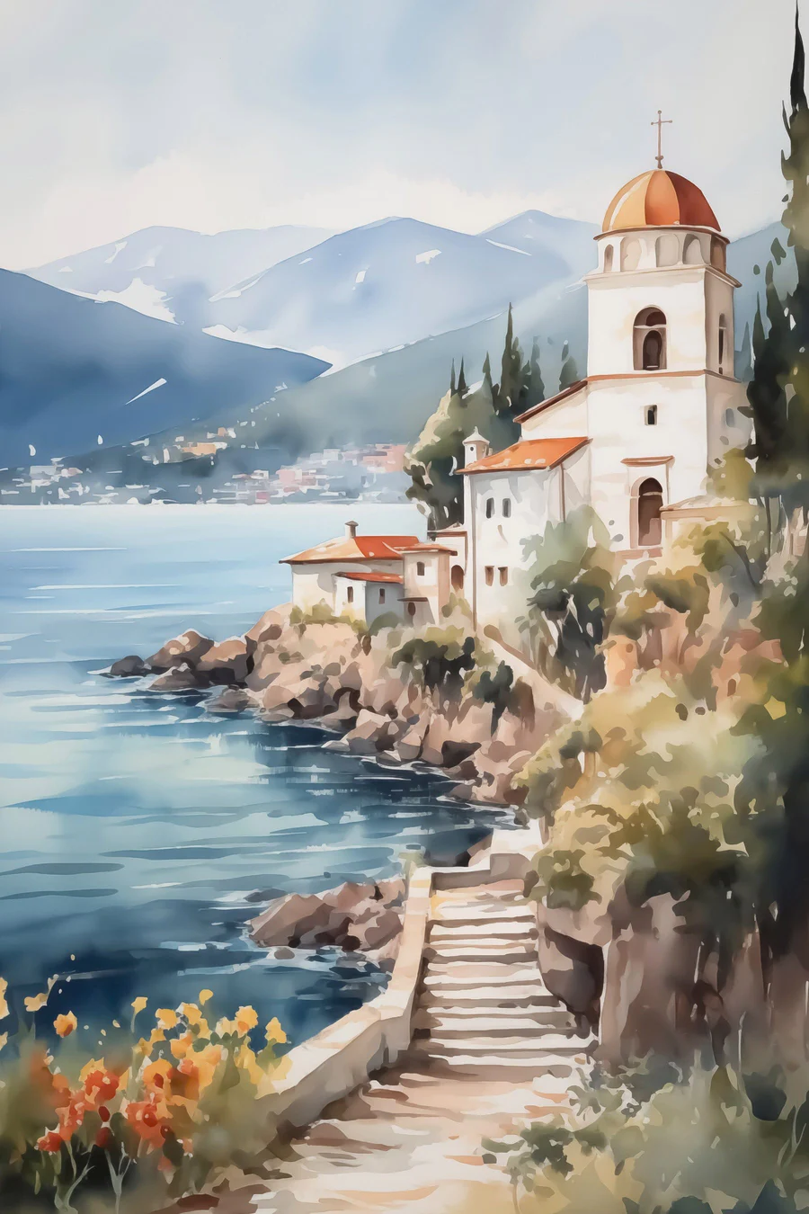 116.67 zł70.00 złObraz Akwarela przedstawiająca biały budynek z niebieskimi drzwiami i kwiatami na klifie
