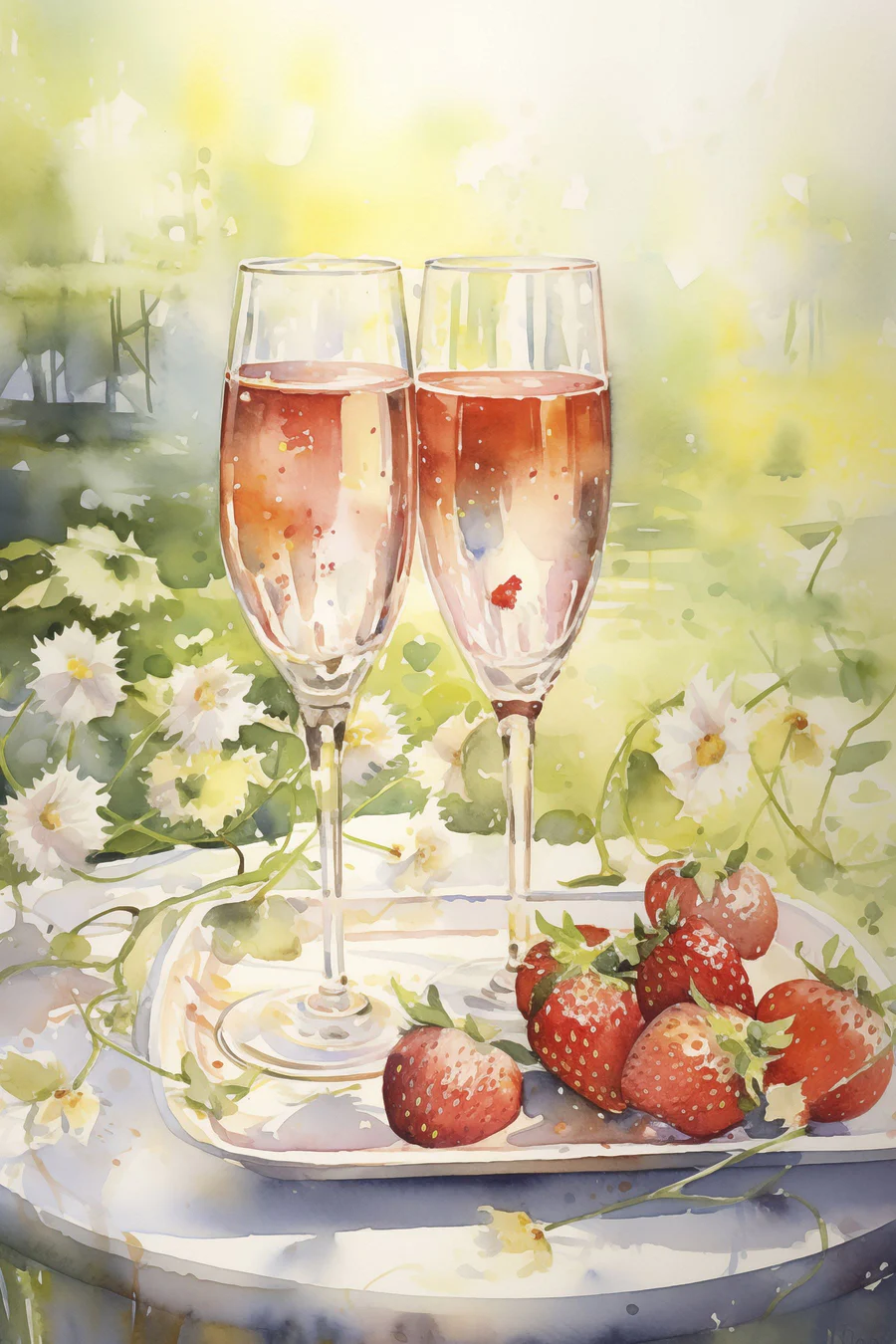 Obraz Akwarela przedstawiająca dwa kieliszki szampana i truskawki na tacy