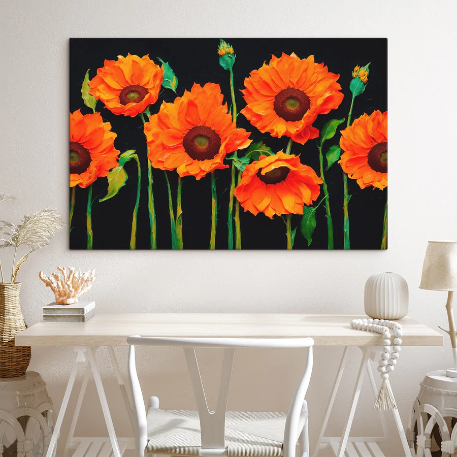 Rozjaśnij każde pomieszczenie dzięki temu wspaniałemu wydrukowi na płótnie z żywą grupą pomarańczowych kwiatów. Te piękności praktycznie wyskakują ze ściany, jakby były gotowe dołączyć do następnego przyjęcia. Wyobraź sobie ciepło, jakie wnoszą do przytulnego zakątka lub tętniącego życiem korytarza - to tak, jakby mieć mały ogród w domu! Odważne kolory na głębokim czarnym tle sprawią, że nawet deszczowy dzień będzie radosny. Idealny dla każdego, kto kocha naturę, ten element wywołuje radość i zachęca do uśmiechu. To prosty sposób na dodanie odrobiny energii do swojej przestrzeni.