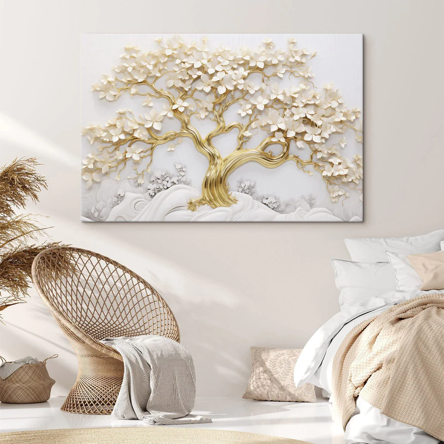 Odmień swoją przestrzeń za pomocą tego czarującego wydruku na płótnie przedstawiającego wspaniałe drzewo ozdobione delikatnymi białymi liśćmi i kapryśnymi kwiatami. To jak zaproszenie powiewu świeżego powietrza do swojego domu. Wyobraź sobie, jak ten obraz może rozjaśnić salon lub przytulny kącik - idealny na leniwe popołudnia, kiedy chcesz się zrelaksować przy dobrej książce. Delikatne kolory i spokojna atmosfera tworzą pogodny nastrój, który jest spokojny, a jednocześnie urzekający. To nie tylko dekoracja; to mały kawałek natury, który wywołuje uśmiech na sercu. Ta grafika może nawet zainspirować marzenia o spokojnym ogrodzie lub spokojnej ucieczce. Idealny dla każdego, kto ceni sobie odrobinę natury bez pyłków!