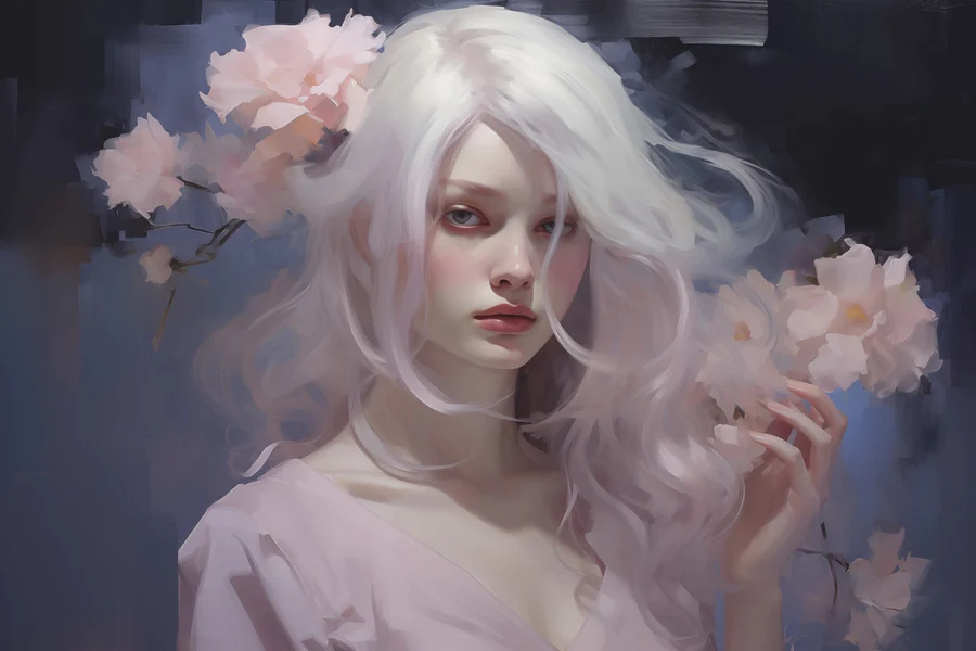 Obraz Kobieta z długimi białymi włosami i różowymi kwiatami
