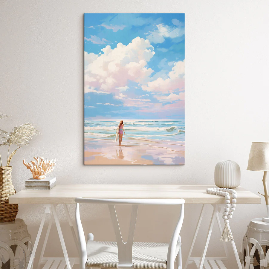 Wnieś kawałek plażowego życia do swojego domu dzięki temu zabawnemu wydrukowi na płótnie. Dziewczyna spaceruje wzdłuż linii brzegowej z deską surfingową w ręku, gotowa złapać kilka fal i rozkoszować się słońcem. Wyobraź to sobie - każdy dzień jest jak słoneczny wypad. Żywe błękity i delikatne róże nieba zachęcają do poczucia spokoju i przygody, zamieniając każdą ścianę w mini miejsce na wakacje. Niezależnie od tego, czy jest to przytulny salon, czy jasna sypialnia, ten element wywołuje radość i marzycielskie plażowe wibracje. Idealny dla marzycieli, miłośników oceanu lub każdego, kto chce dodać trochę słońca do swojej przestrzeni!
