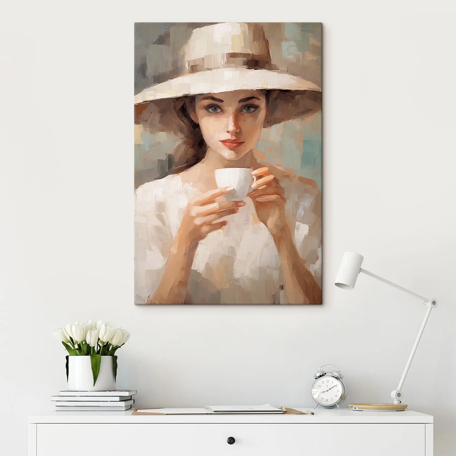 Obraz Kobieta w kapeluszu trzymająca kubek